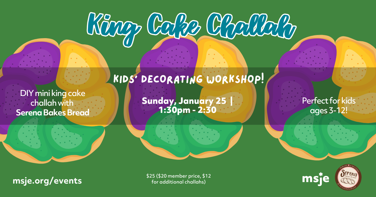Museum of the Southern Jewish Experience 818 Howard Ave, New Orleans, LA, United StatesCelebrate Mardi Gras with a Jewish twist at our annual King Cake Challah event for kids and families (ideal for ages 3-12). SerenaBakesBread will lead the one-hour workshop where kiddos will decorate their own miniature king cake, baked with challah dough and stuffed with cinnamon filling, and do a Carnival-themed craft. Refreshments will be served. The …